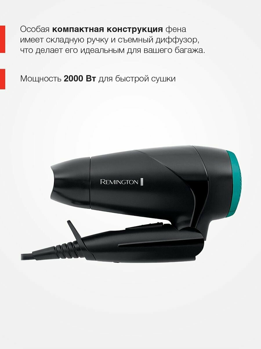 Фен для волос Remington On The Go D1500, дорожный, 2000 Вт, 2 режима скорости/температуры, складная ручка, международное напряжение, черный