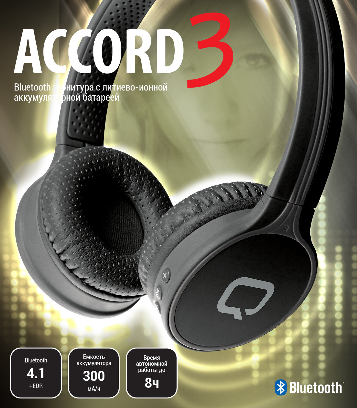 Беспроводная Bluetooth гарнитура Qumo Accord 3 (BT 0020) черный, накладная, 300 мА-ч, до 6 часов в режиме разговора