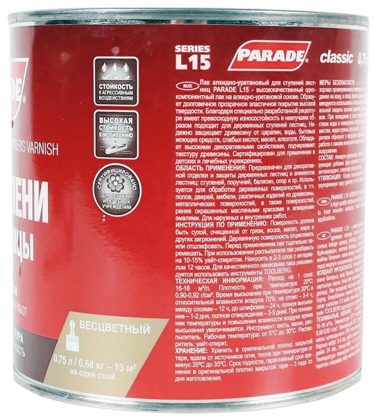 Лак алкидно-уретановый PARADE L15 Ступени & Лестницы глянцевый 0,75л интересное: