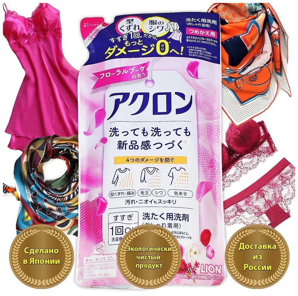 LION Жидкое средство для стирки ACRON деликатных тканей, шерсти, аромат цветов, 400 мл. сменная упаковка