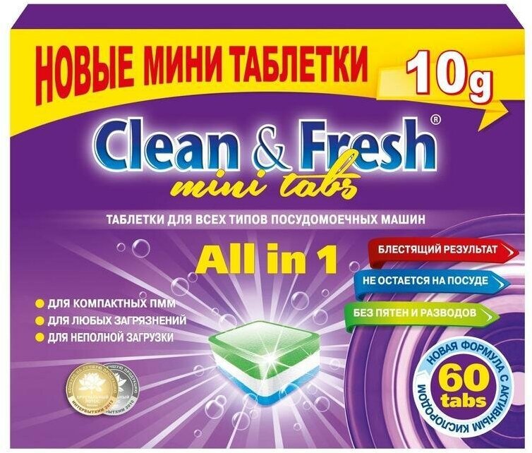 Мини-таблетки для посудомоечных машин Clean & Fresh CLEAN&FRESH All in 1, 60 шт*10 г