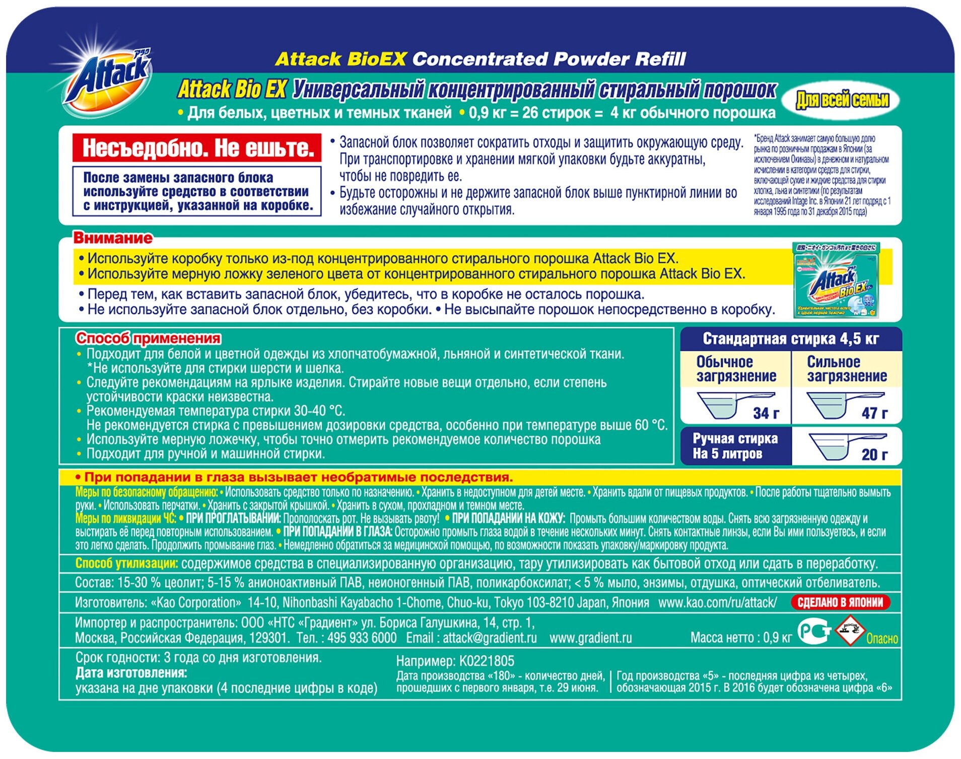 Стиральный порошок Attack BioEX, универсальный, концентрированный, запасной блок, 900 г