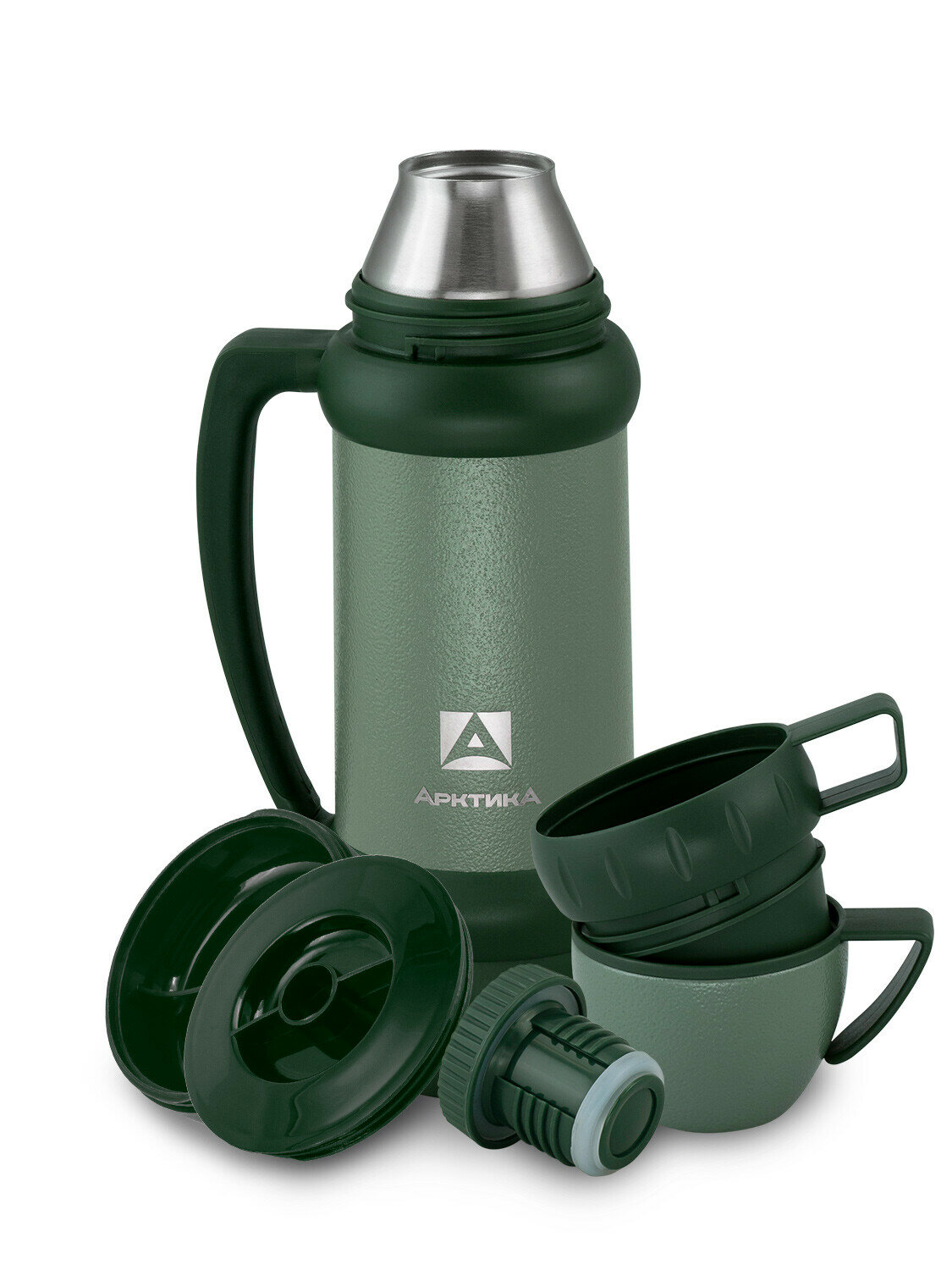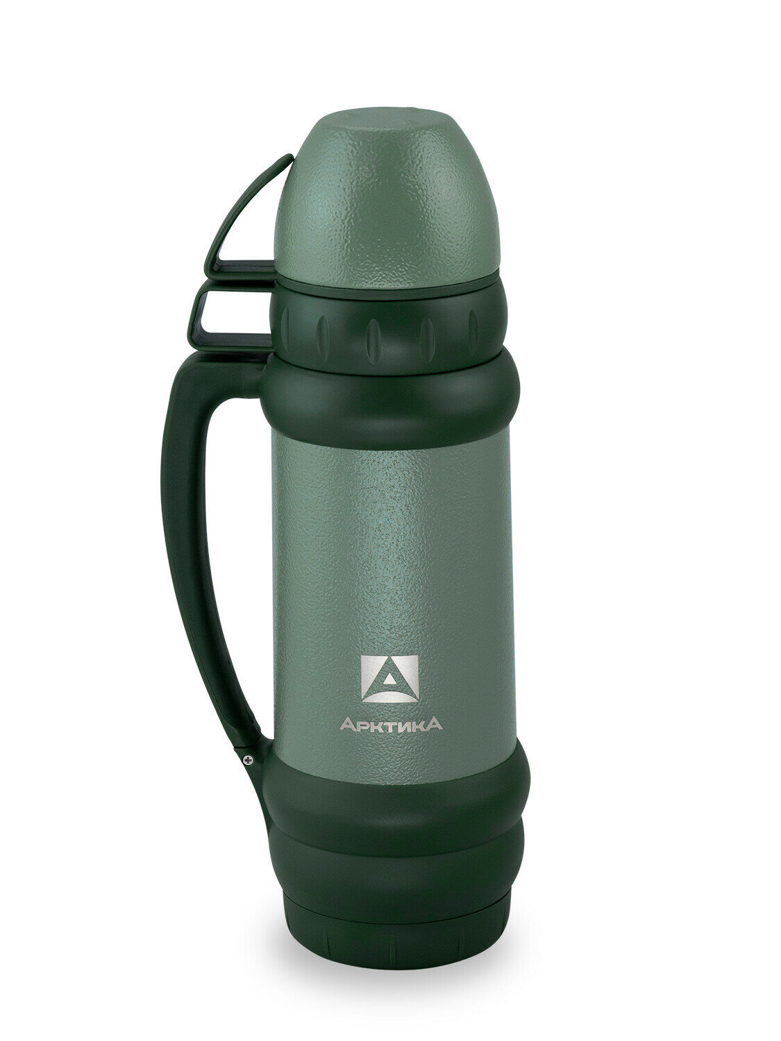 Купить Термос Арктика 109-1000М, узк. горло, 1л (зеленый) молот. сталь, ручка, 2 чашки+емк, нерж. сталь
