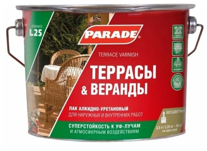 PARADE Лак алкидно-уретановый L25 Террасы & Веранды Матовый 2,5л Россия 90003467431 интересное: