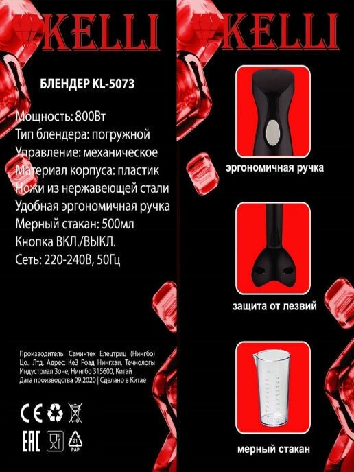 Блендер KELLI KL-5073, погружной, 800 Вт, 1 скорость, стакан 0.5 л, чёрный Kelli 6709307