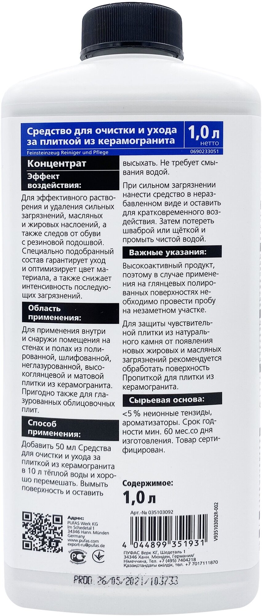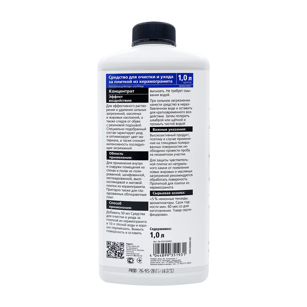 Пуфас Glutoclean N351 Средство для очистки и ухода за плиткой из керамогранита (1л) интересное: