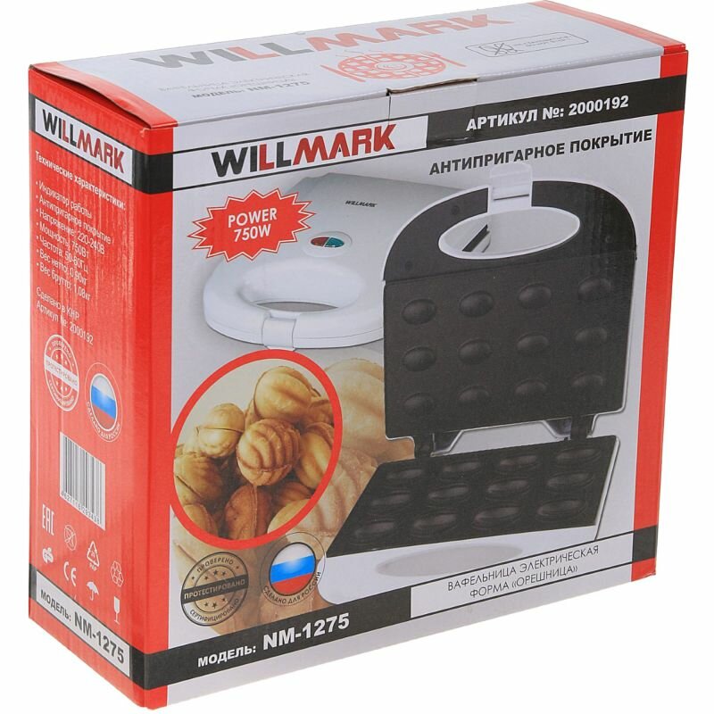 Вафельница WILLMARK NM-1275 (12 овальных полуформ "орех", мощность 750Вт,белая)