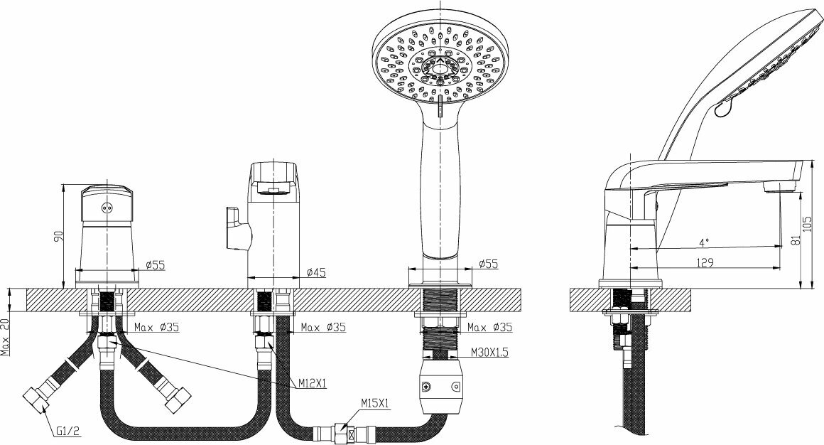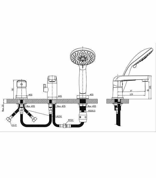 Смеситель Rossinka S35-39 на борт ванны на 3 отверстия