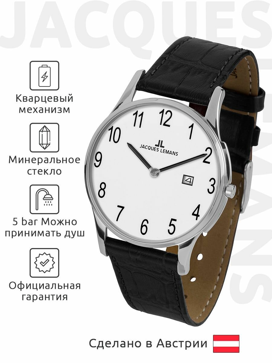 Австрийские кварцевые часы Jacques Lemans London 1-1937D на кожанном браслете, с водозащитой 5 бар и международной гарантией от производителя (1-1937D)