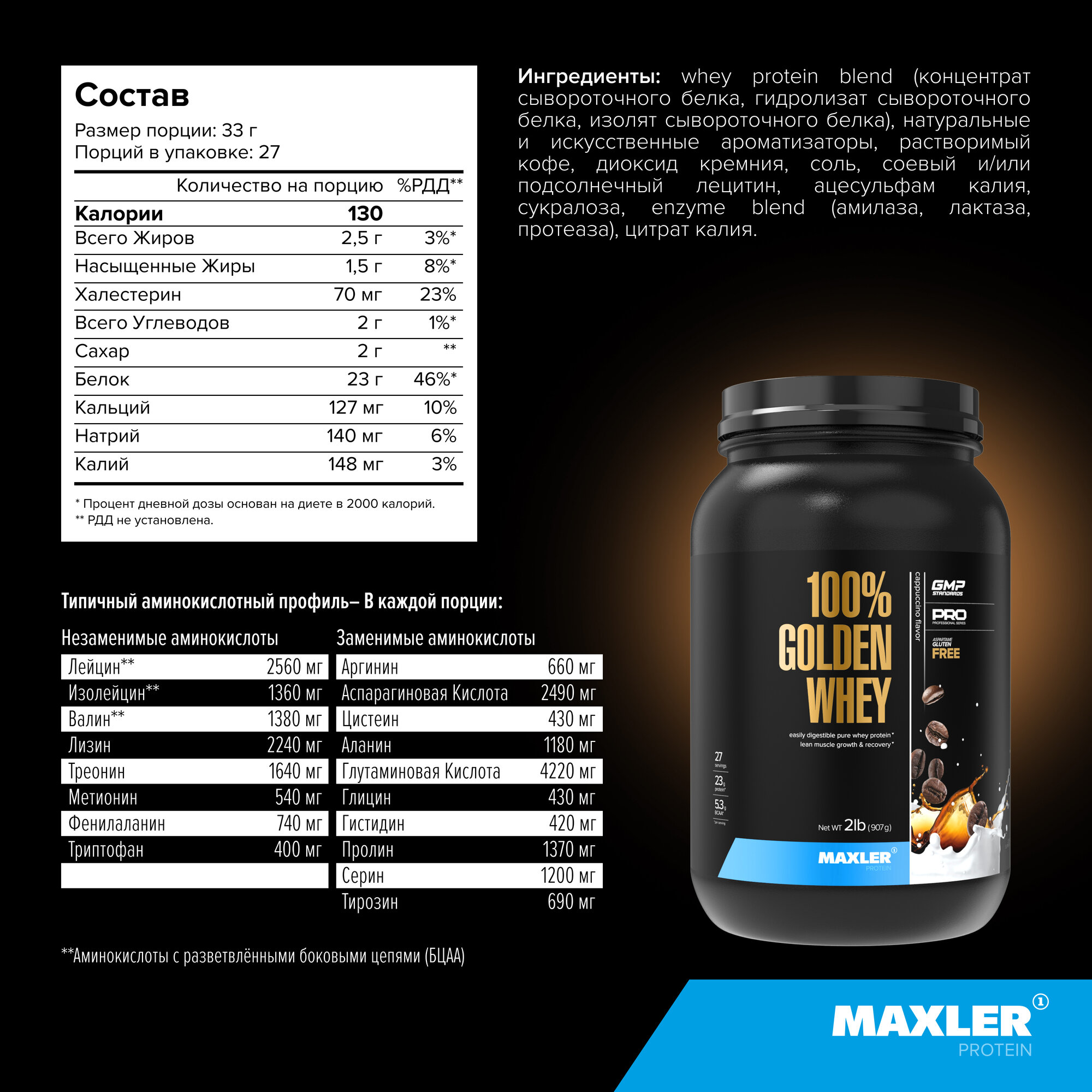 Чистый сывороточный белок премиум класса 100% Golden Whey Protein 908 гр 2 lb (Maxler) Капучино