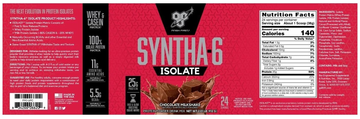 BSN, Syntha-6 Isolate, Protein Powder Drink Mix, Chocolate Milkshake, 4.02 lb (1.82 kg)