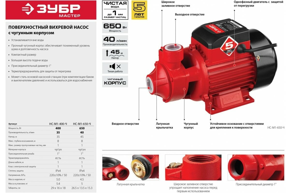 ЗУБР 650 Вт , поверхностный вихревой насос, корпус из чугуна (НС-М1-650-Ч)