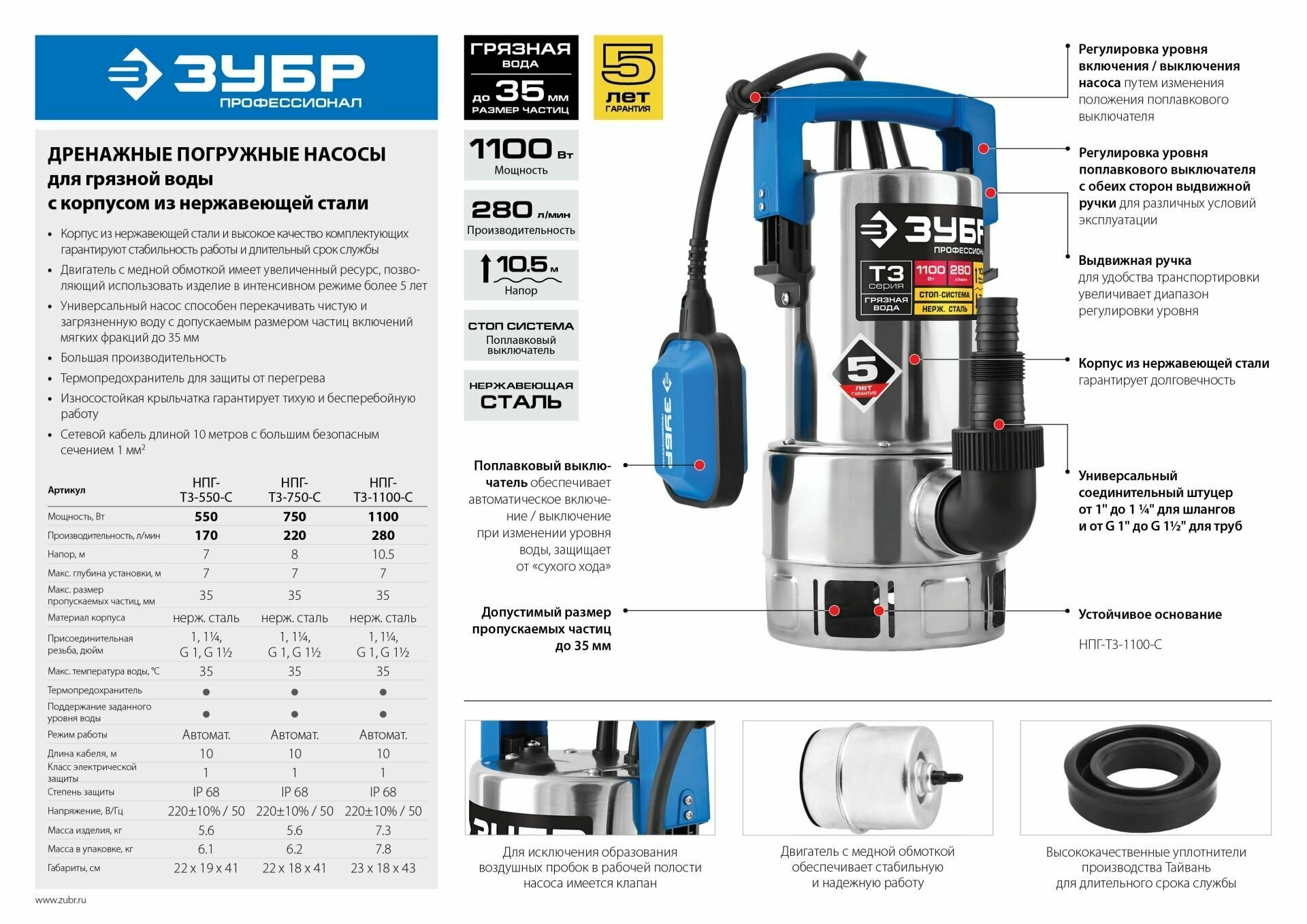 ЗУБР Насос Т3 погружной, ЗУБР Профессионал НПГ-Т3-1100-С, дренажн для грязн воды (d частиц до 35мм), 1100Вт, 280л/мин, напор 10.5м,нерж сталь, провод 10м, ( НПГ-Т3-1100-С )