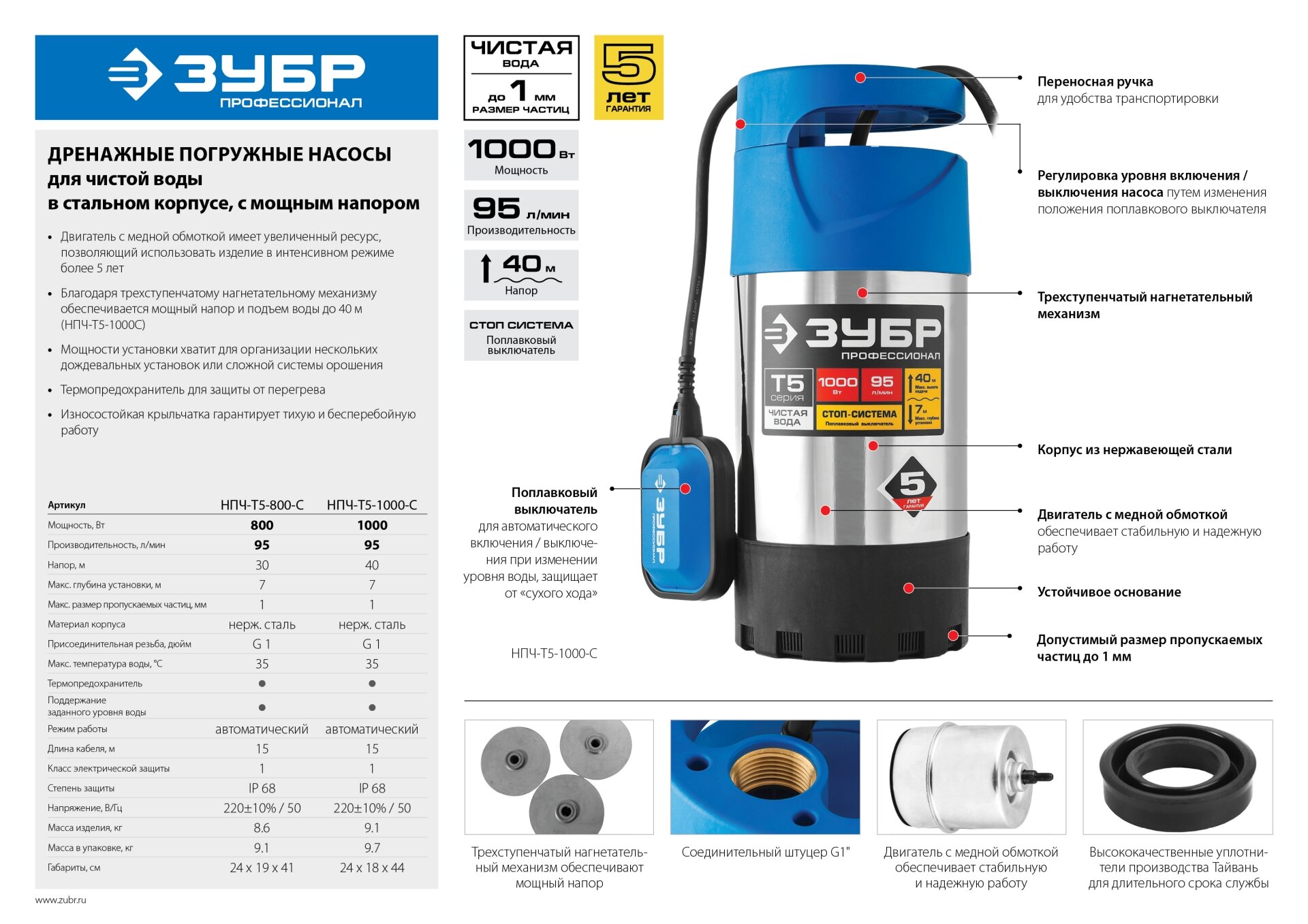 Насос ЗУБР НПЧ-Т5-800-С профессионал т5 погружной дренажный для чистой воды d частиц до 5мм 800Вт