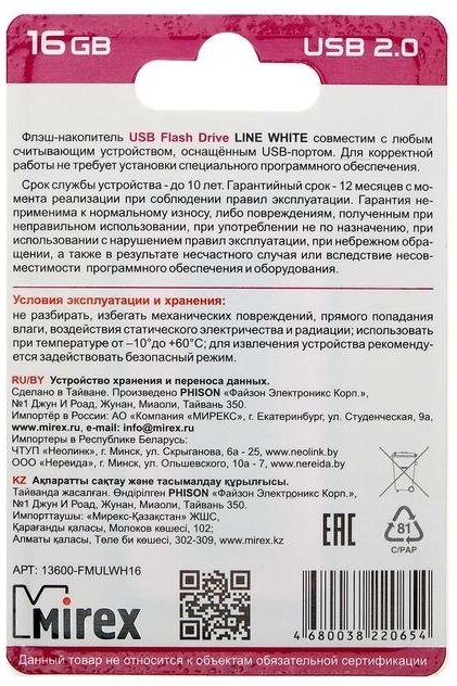 Флешка Mirex LINE WHITE, 16 Гб, USB2.0, чт до 25 Мб/с, зап до 15 Мб/с, белая интересное: