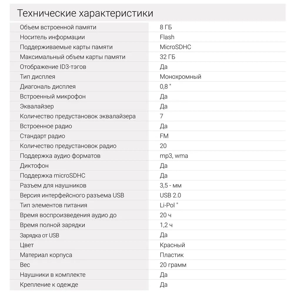 | Плюсы: | Компактный, долгоиграющий, крепкая клипса, простое меню на русском, даже диктофон есть, расширение памяти до 32 ГБ за счет микро-СД флешки |