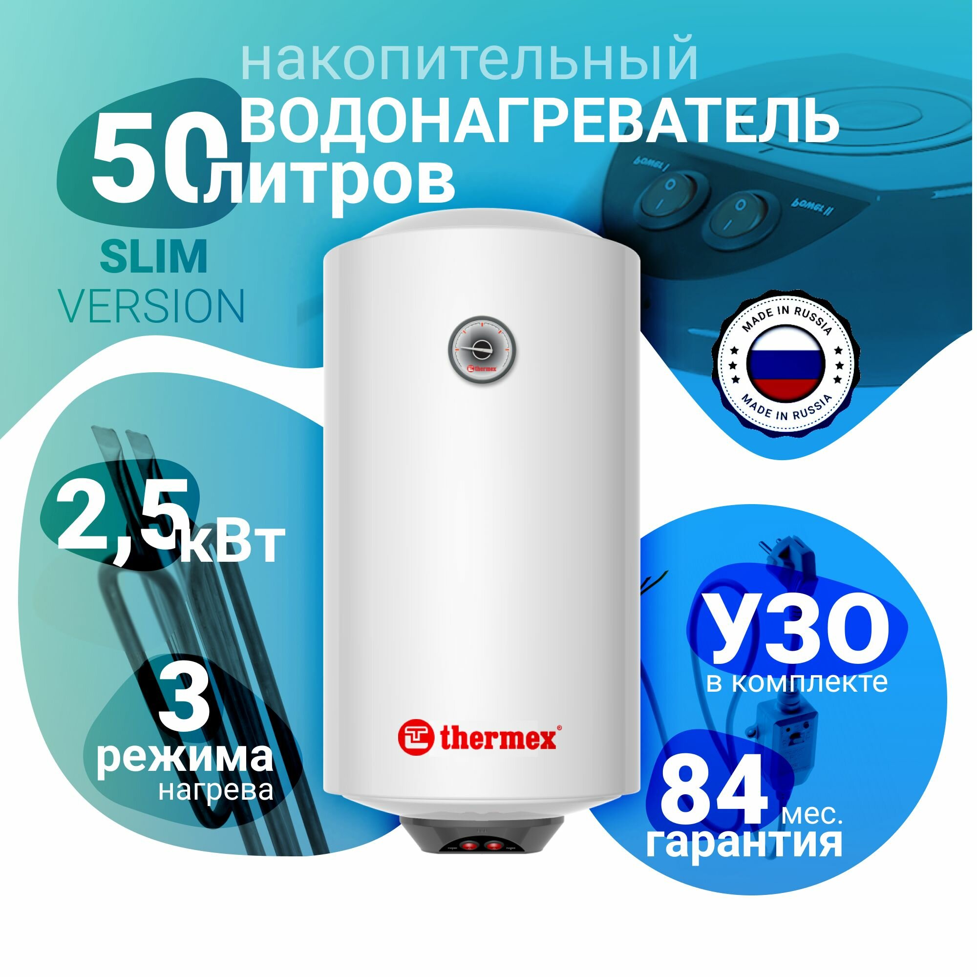 | Плюсы: | Тэны 2,5 кВт (1+1,5) на 50 литров.