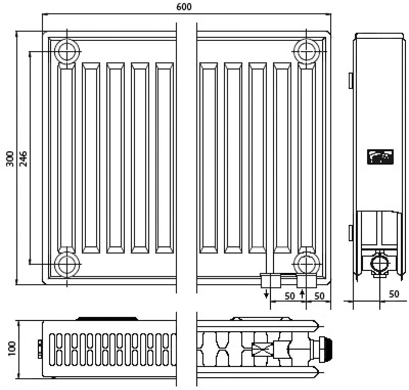 Радиатор панельный KERMI Profil-V_FTV тип 22 высота 300 ширина 600 профильный, нижнее подключение 3/4"