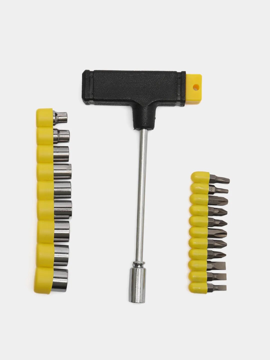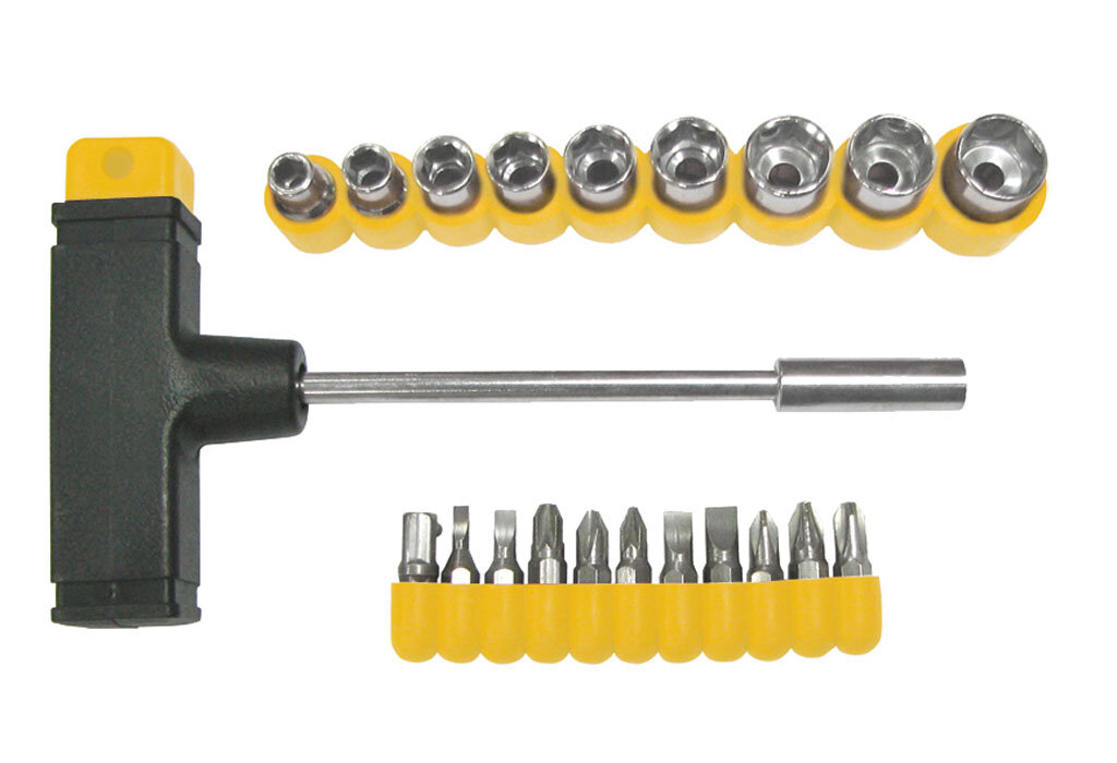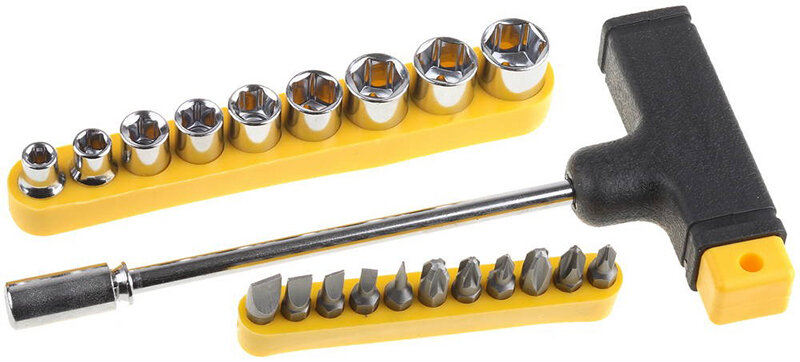 Отвертка Т-образная с набором бит и торцевых головок Biber 85553, 20 предм., желтый/черный