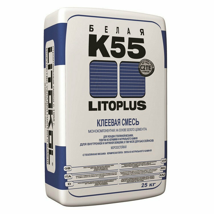 Клей для плитки/ керамогранита/ мозаики/ камня LitoPlus K55 белый (класс С2 ТЕ) 25 кг