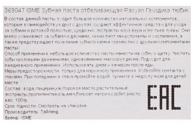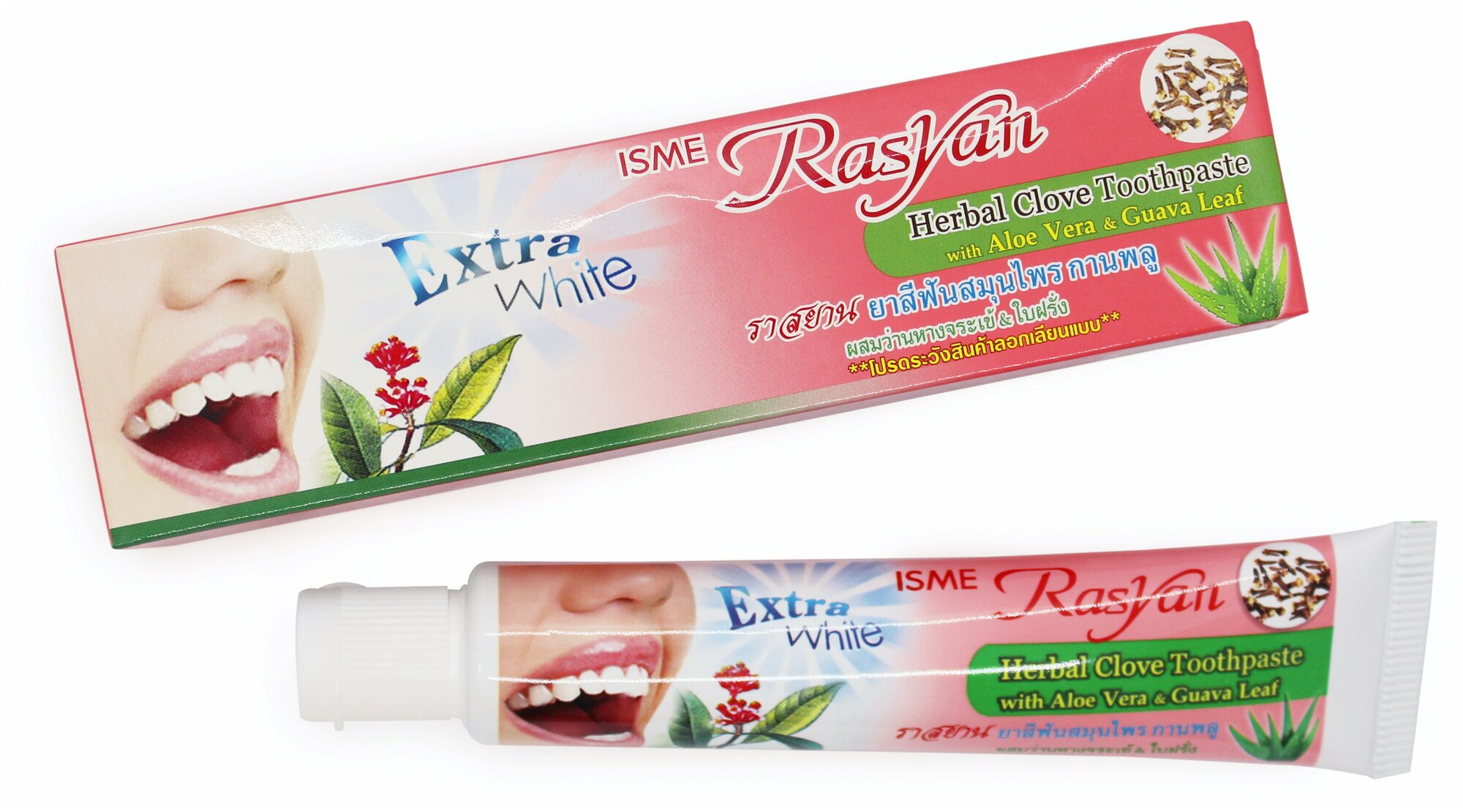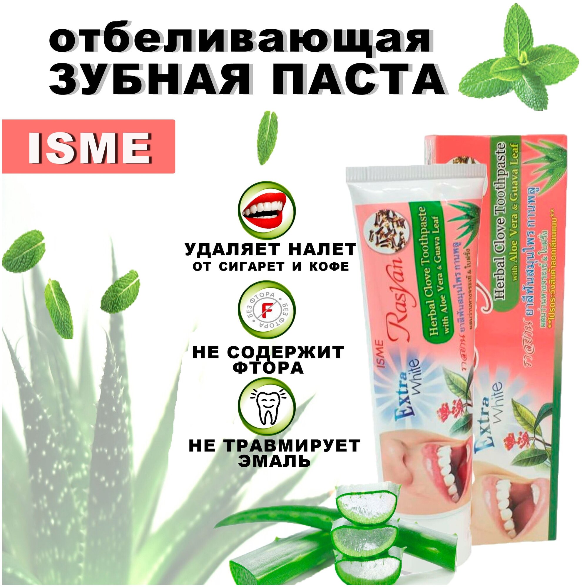 Отбеливающая Тайская зубная паста ISME Rasyan травяная гвоздичная с алоэ вера и листьями гуавы, 30 мл, 30 г