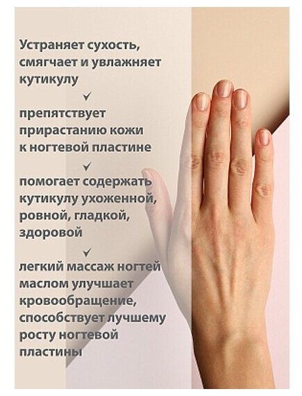 | Плюсы: | Хорошее масло,приятный запах,хорошо смягчает кутикулу и питает ногти. |