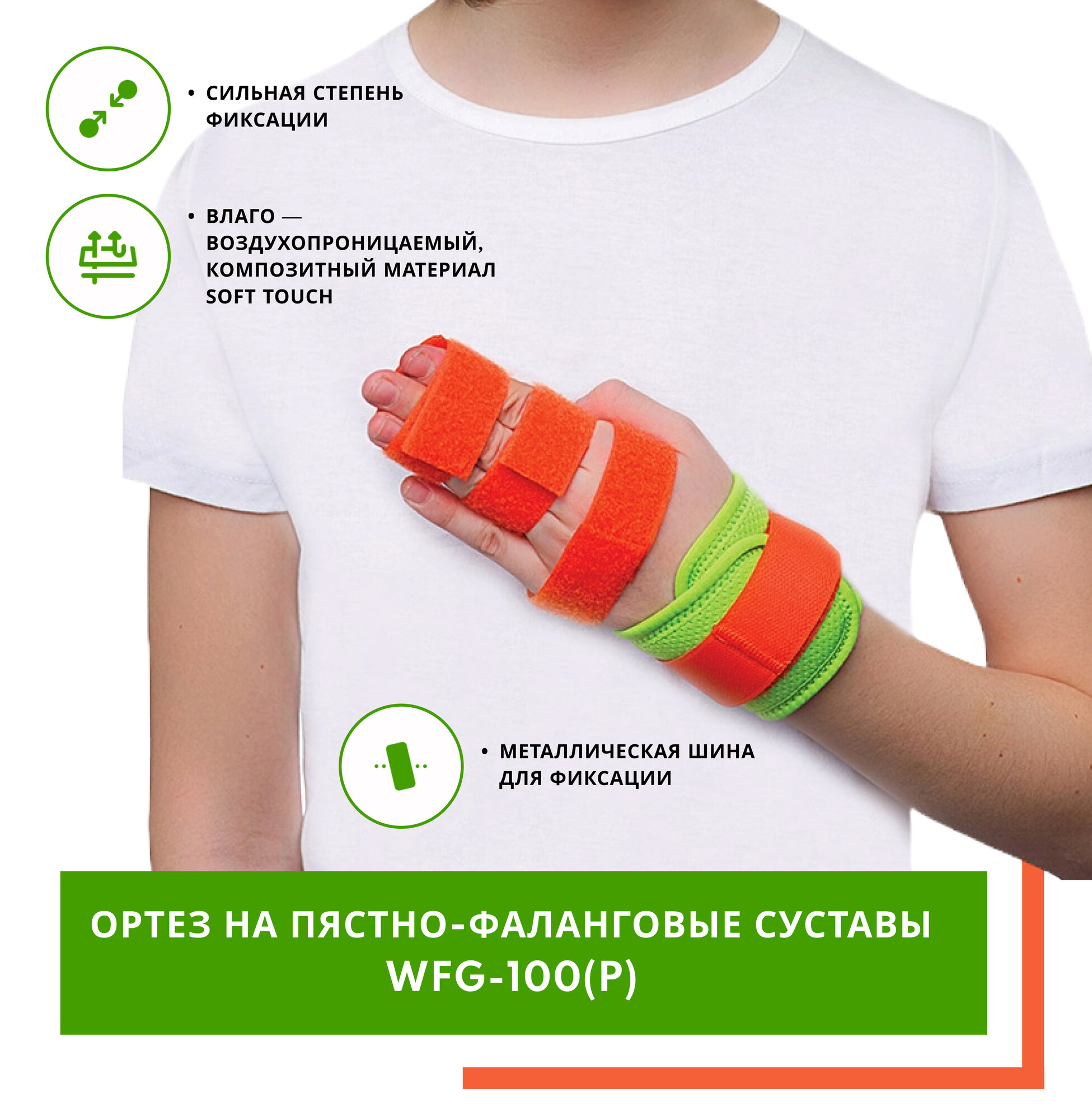 ORLETT Х0041428 Ортез на пястно-фаланговый сустав детский Orlett WFG-100(P) (L / Ярко-зеленый с элементами оранжевого)