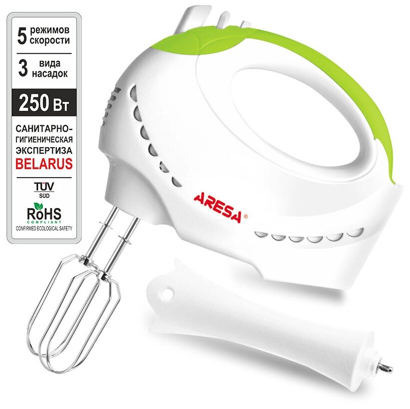 Миксер Aresa AR-1904 (250Вт, 5 скоростей, белый/зеленый) интересное:
