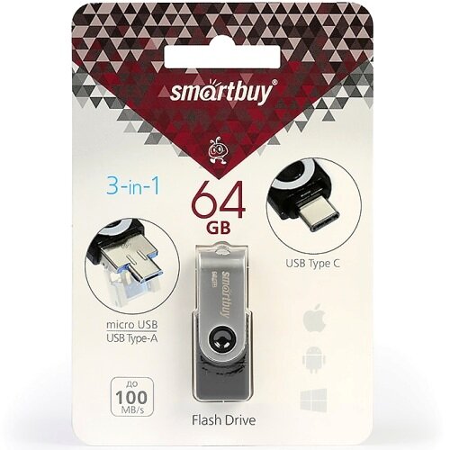 Флешка Smartbuy TRIO 3-in-1 OTG,128Гб, USB3.0, Type-C,microUSB, чт до 100Мб/с, зап до 10Мб/с 9864194