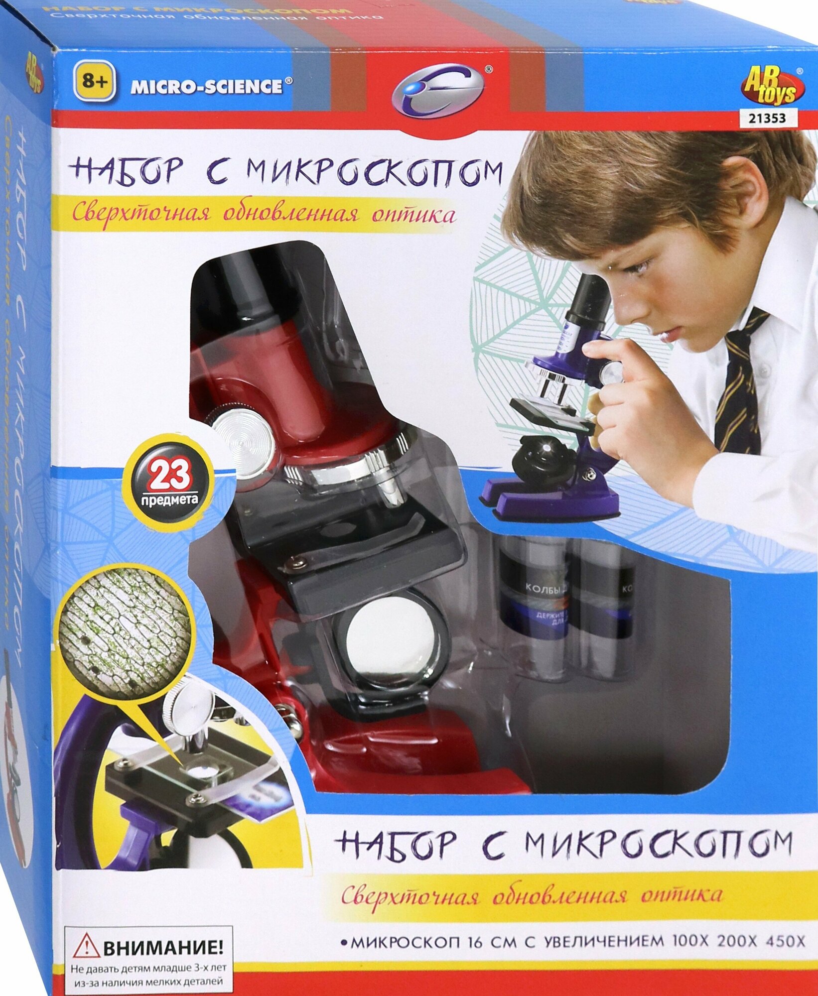 Микроскоп c аксессуарами увеличение 100х200х450х, 23 предмета, красный, металл, пластмасса