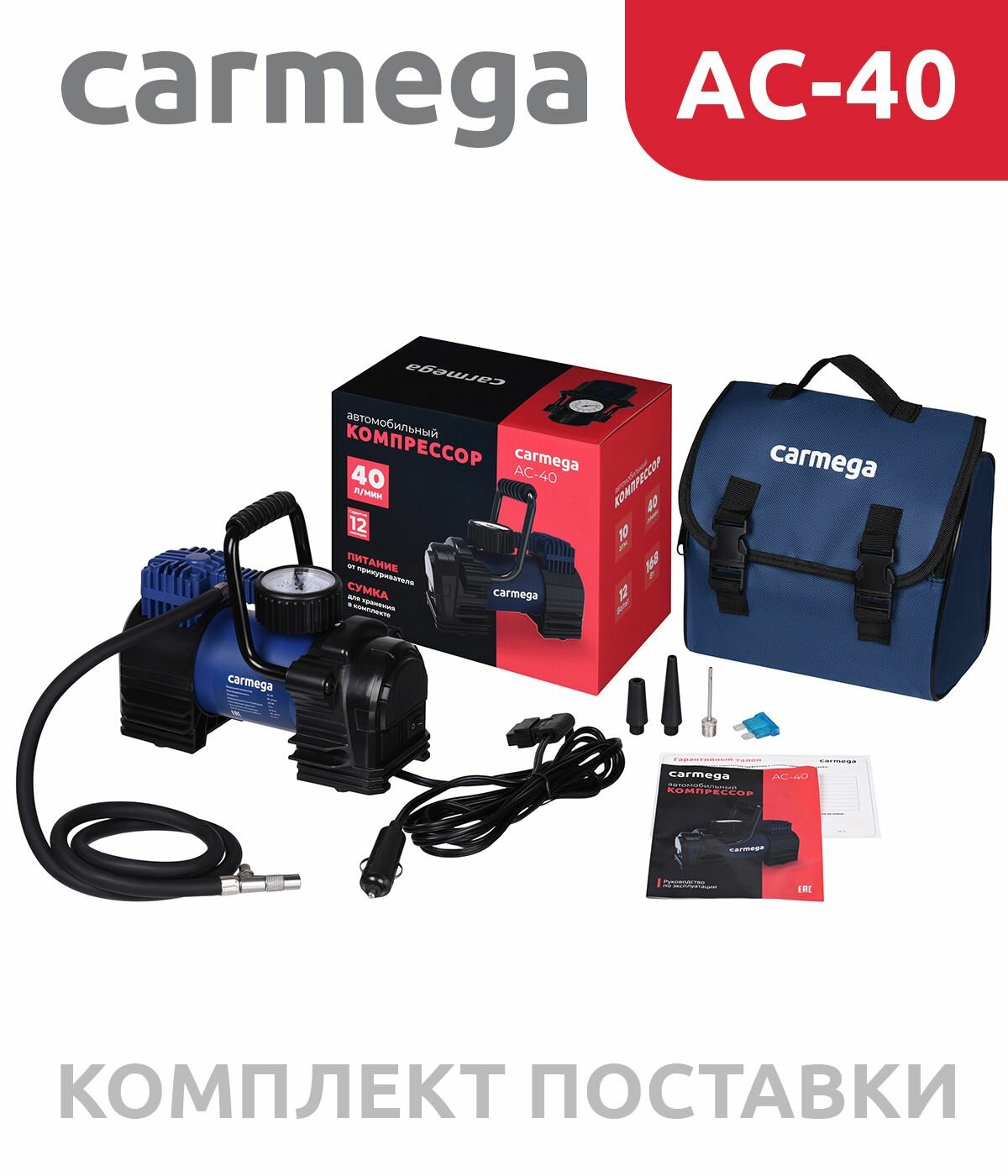 Компрессор автомобильный CARMEGA AC-40, металлический 40 л/мин от прикуривателя с сумкой