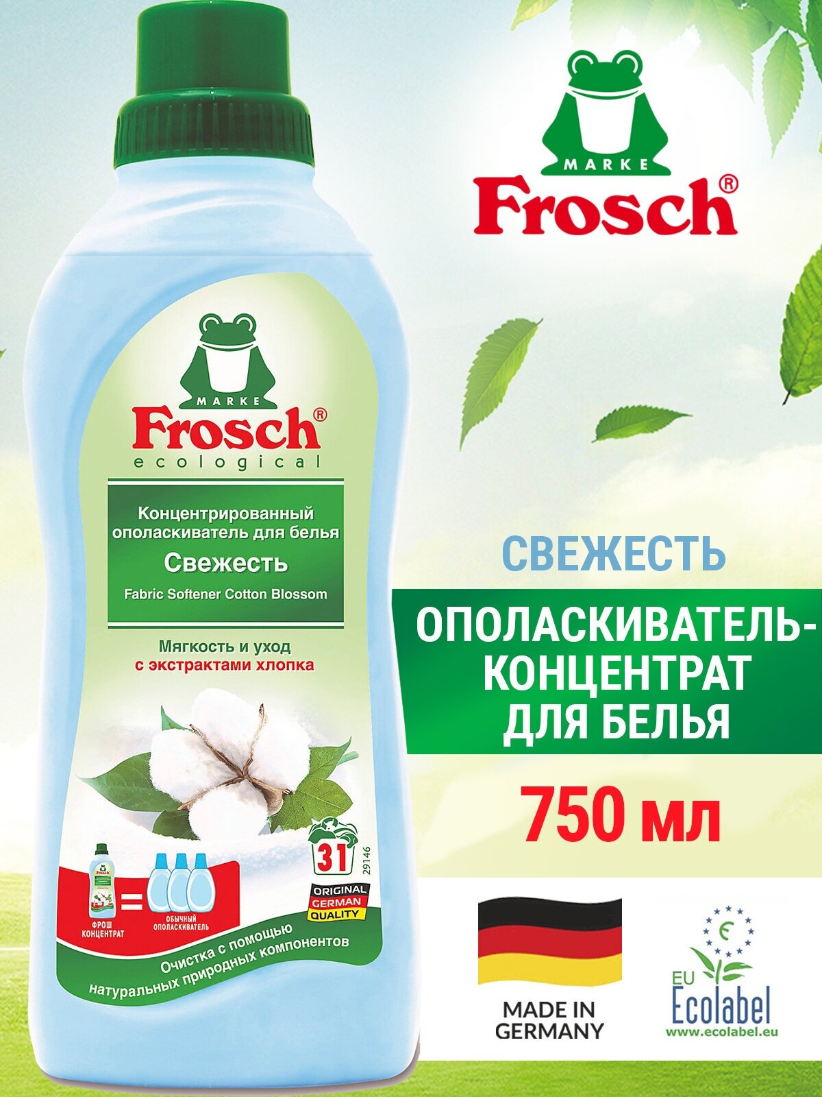 Кондиционер-ополаскиватель для белья Frosch фрош Свежесть (Цветы хлопка), концентрированный, 750 мл