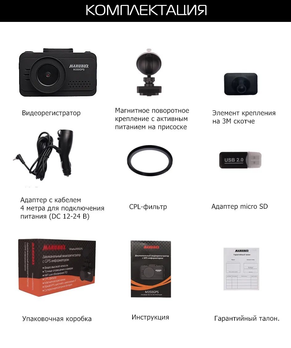 Видеорегистратор с GPS-информатором Marubox M350GPS + SanDisk microSDXC UHS-I 64Gb (120mb/sec)