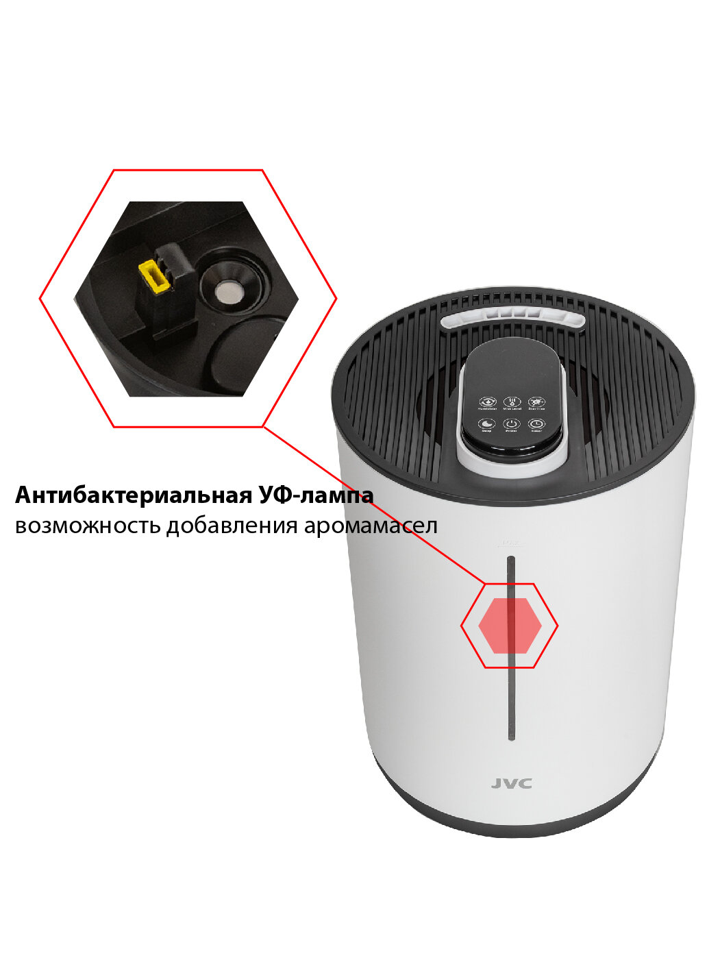 Увлажнитель воздуха ультразвуковой JVC с сенсорным управлением, 3 уровня подачи пара, УФ-лампа, ночник 7 цветов, пульт ДУ, 25 Вт интересное: