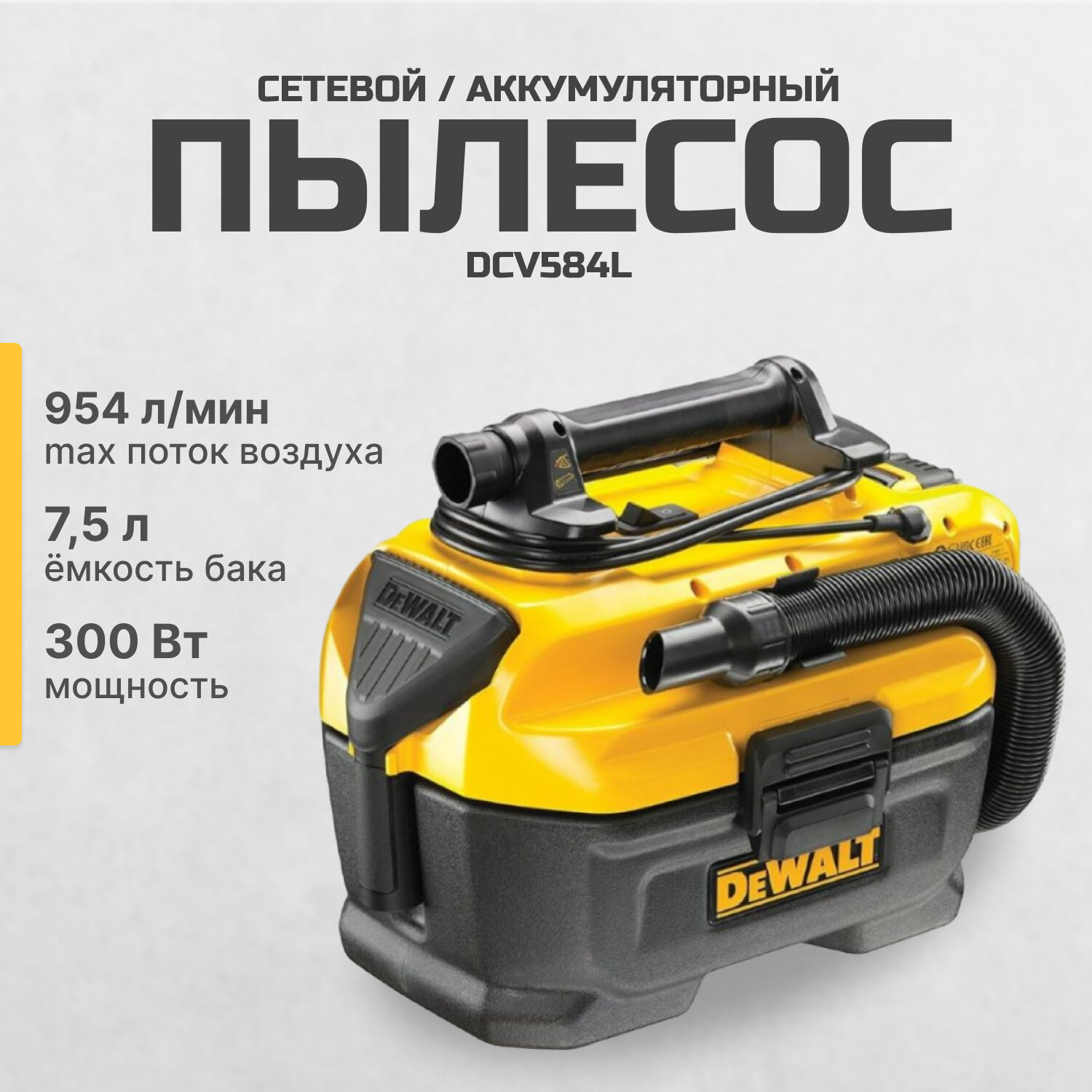 Пылесос DeWALT DCV584L, 300 Вт, 954 л/мин, 7.5 л