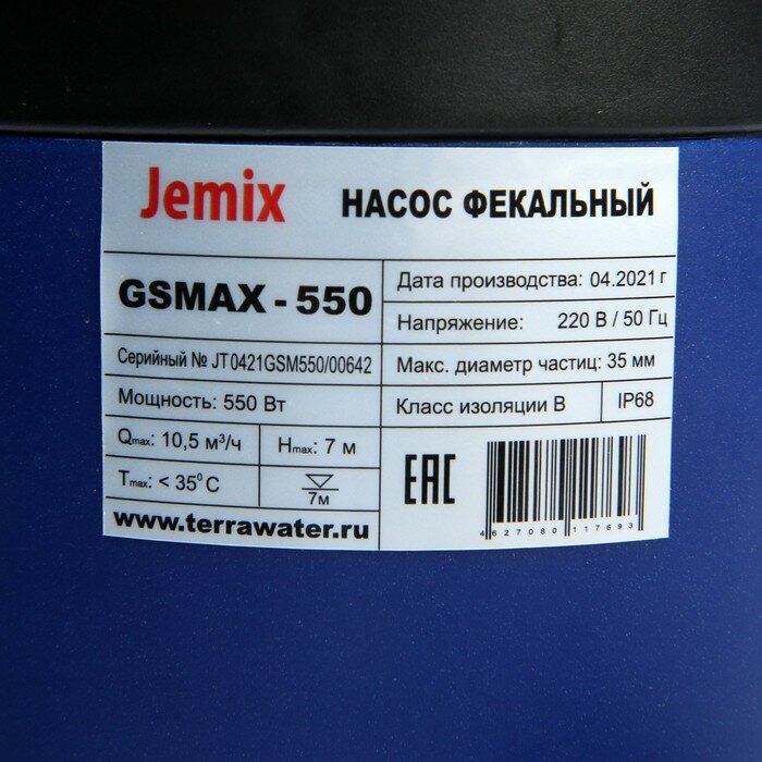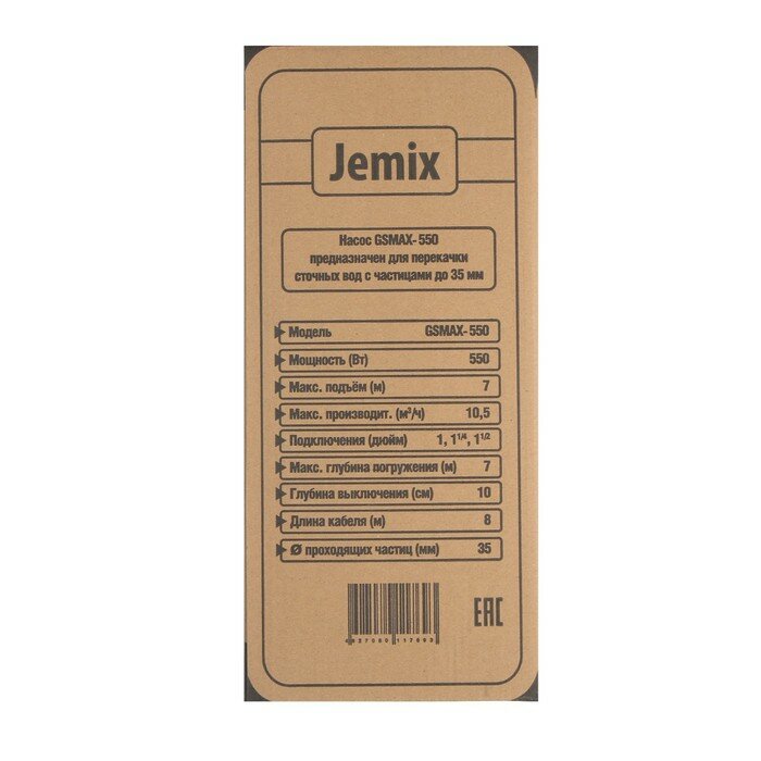 JEMIX Насос фекальный JEMIX GSMAX-550, 550 Вт, напор 7 м, 175 л/мин, диаметр частиц 35 мм интересное: