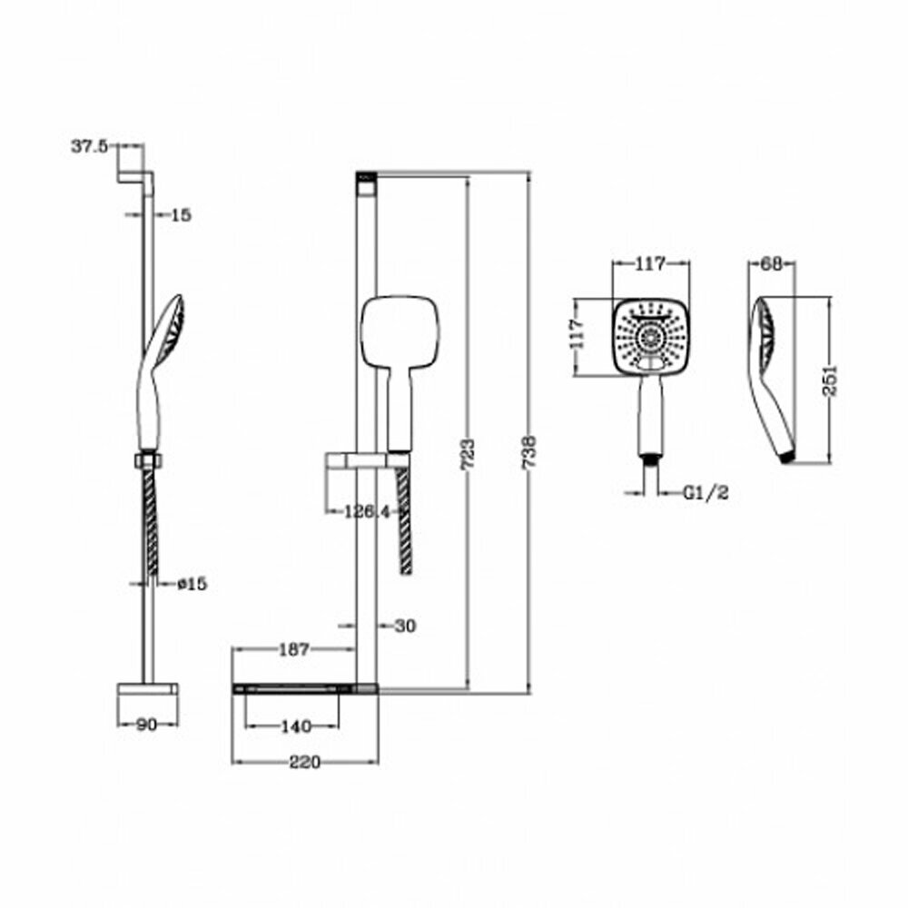 | Дополнительная информация | высота стойки для душа: 738 мм; диаметр душевой лейки: 117 мм |