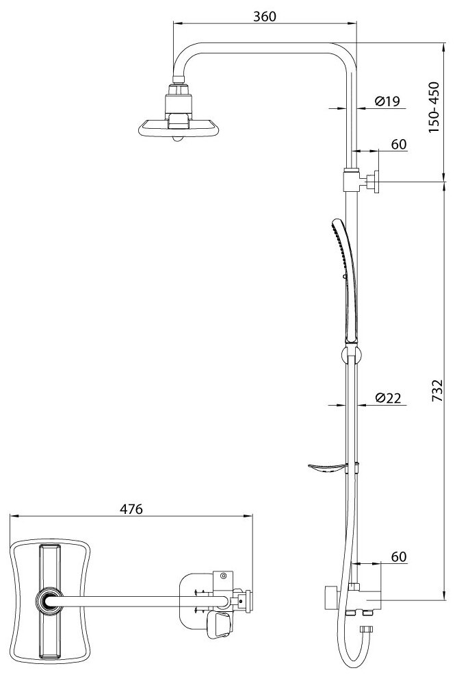 | Дополнительная информация | высота стойки для душа: 1182 мм; длина верхнего душа: 146 мм; ширина верхнего душа: 227 мм |