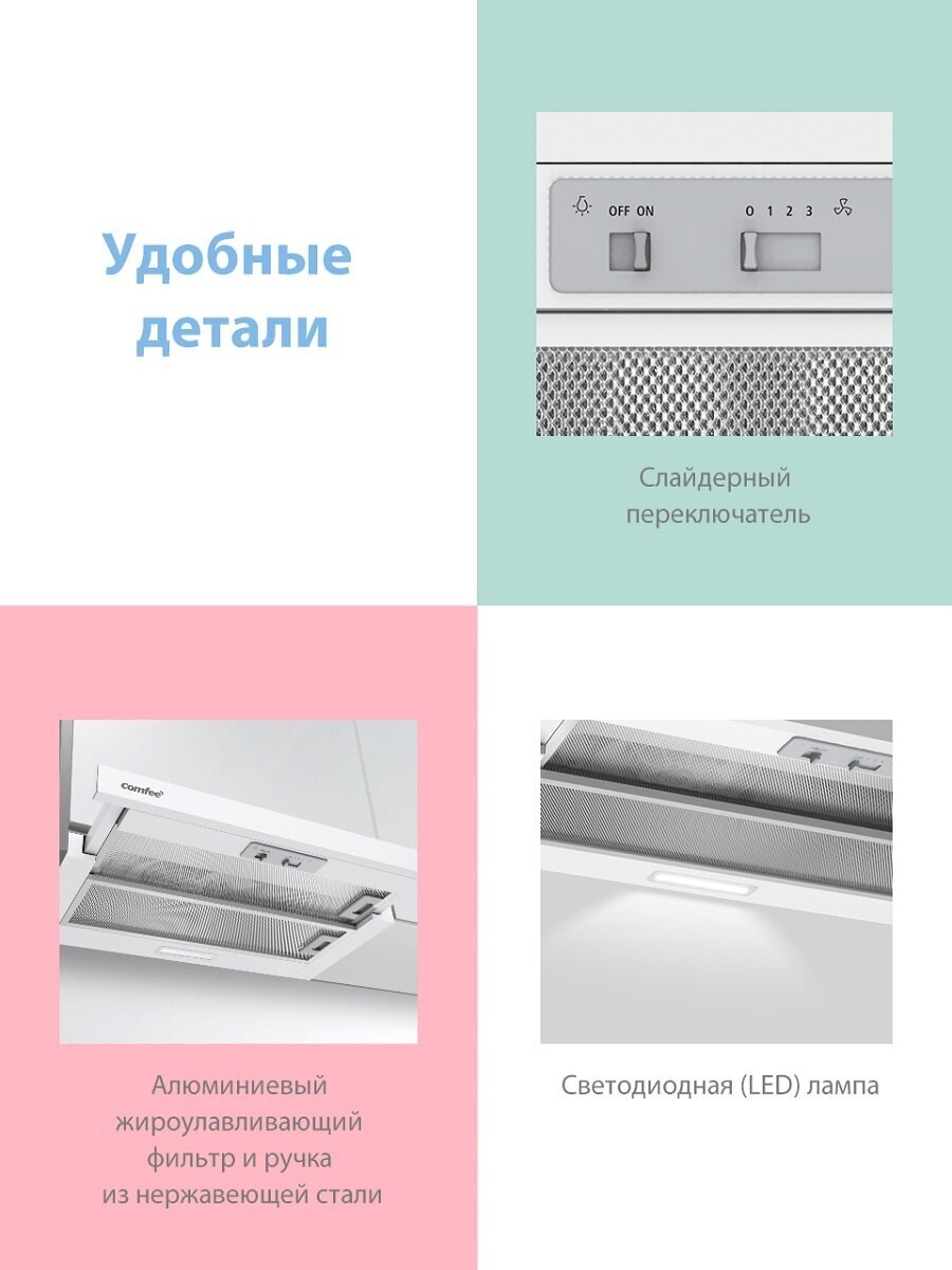 Встраиваемая вытяжка Comfee CHT600W, цвет корпуса белый, цвет окантовки/панели белый интересное: