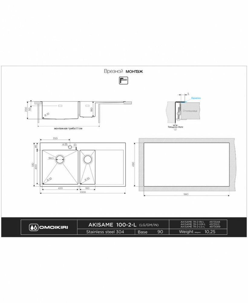Кухонная мойка OMOIKIRI Akisame 100-2-IN-R 4973547 (1000 x 510 мм), врезная, нержавеющая сталь