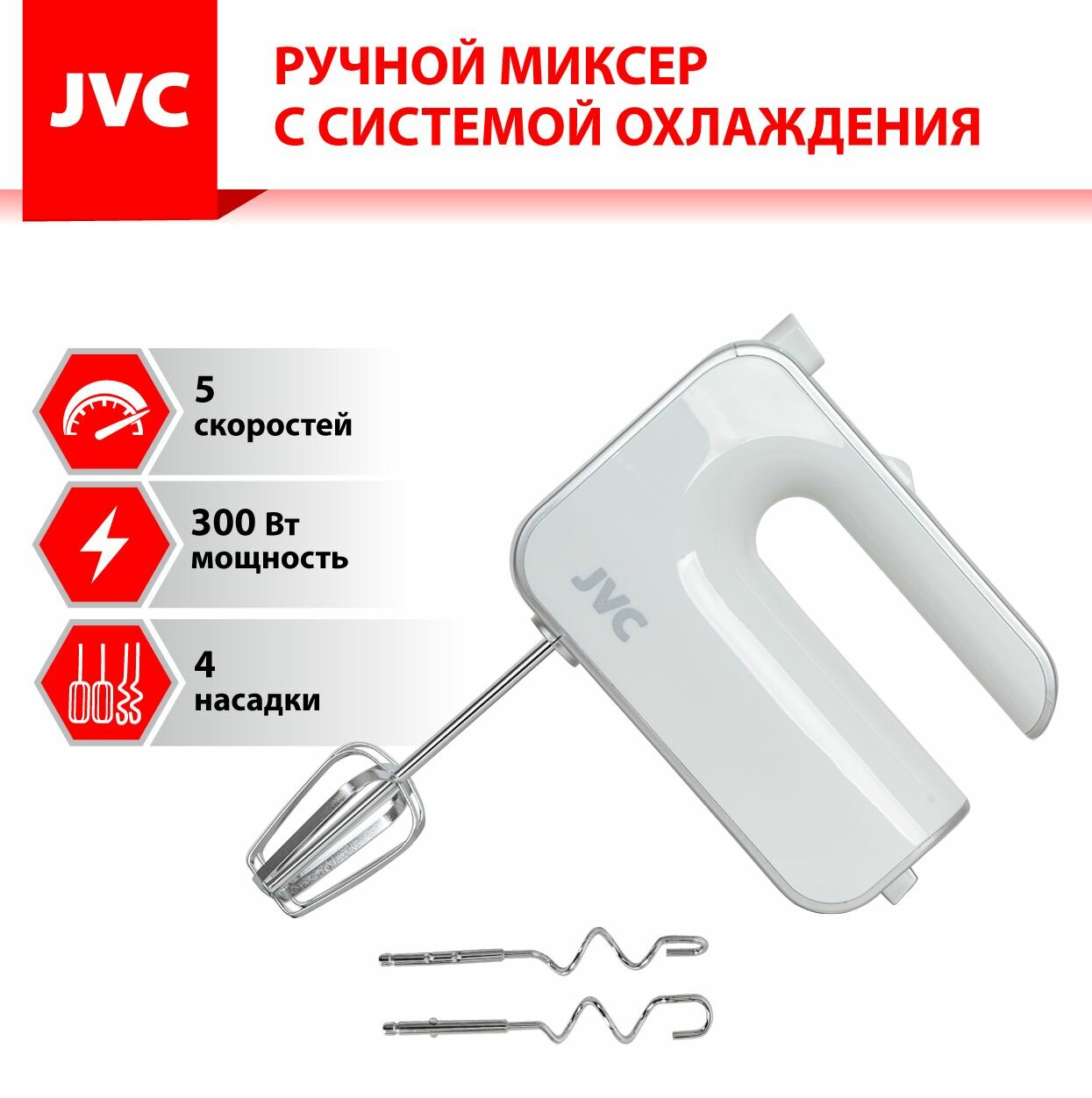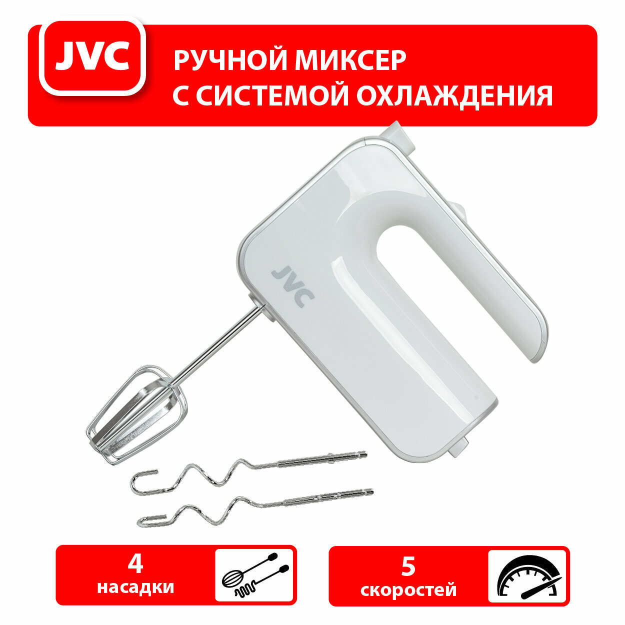 Ручной миксер JVC JK-MX115 домашний с эффективной системой охлаждения, 5 скоростей, 4 насадки, 300 Вт