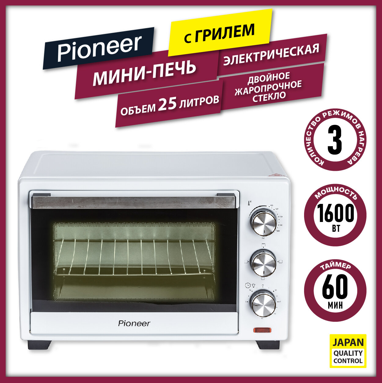Мини-печь Pioneer 25 литров с грилем, регулировкой температуры, 3 режима нагрева / Печка с двойным жаропрочным стеклом / Электропечь / Печь духовка