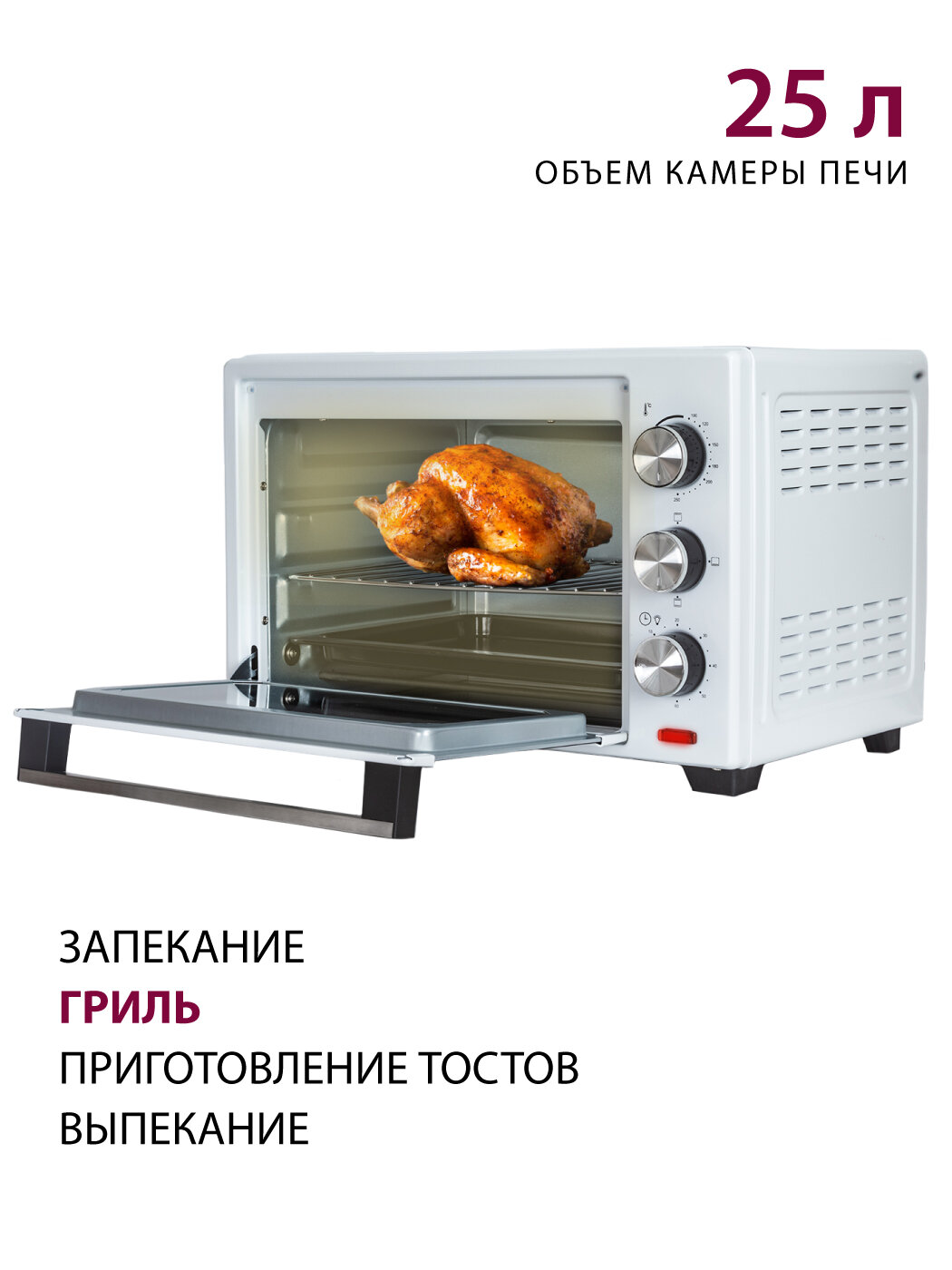 Мини-печь Pioneer 25 литров с грилем, регулировкой температуры, 3 режима нагрева / Печка с двойным жаропрочным стеклом / Электрическая печь с таймером / Электропечь / Печь духовка, 1600 Вт