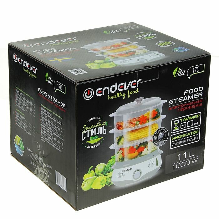 Купить Пароварка Endever Vita-170, электрическая, 1000 Вт, 11 л, 3 яруса, бело-серая