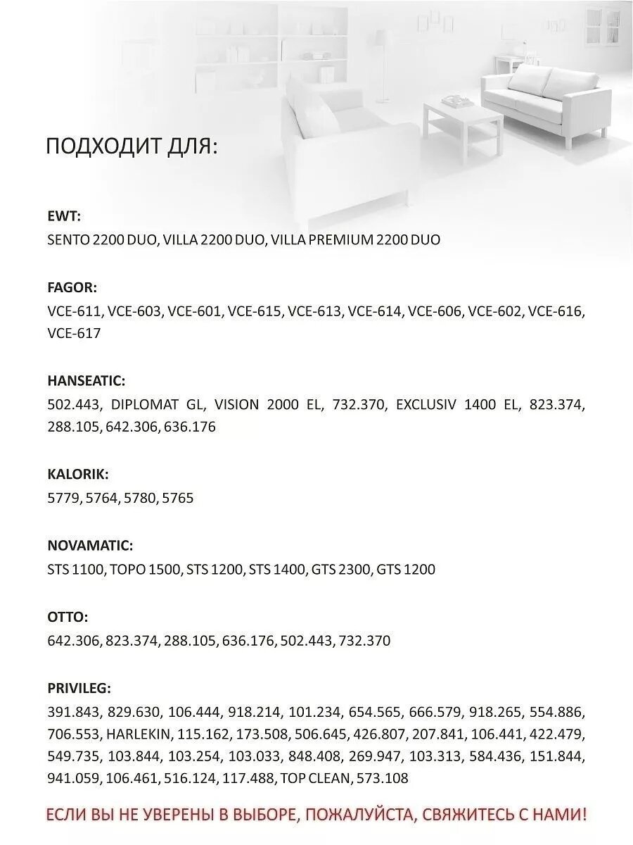 | Совместимые модели | Bork, Dirt Devil, Eio, Ewt, Thomas, Trisa, Ufesa, Zanussi, Caveron, Novomatic, |