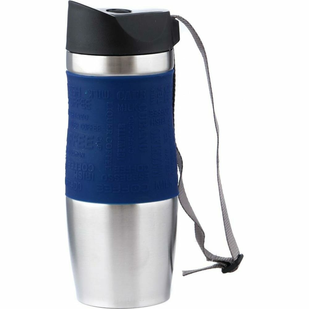 Купить Термокружка AGNESS 400мл с кнопкой стоппером и ремешком нерж.сталь, пластик синяя