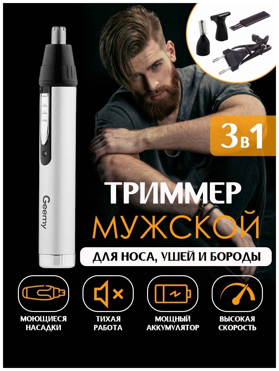 Триммер мужской 3в1 серебристый, для носа и ушей, окантовки усов и бороды, бровей, для удаления волос, подарок для мужчины интересное: