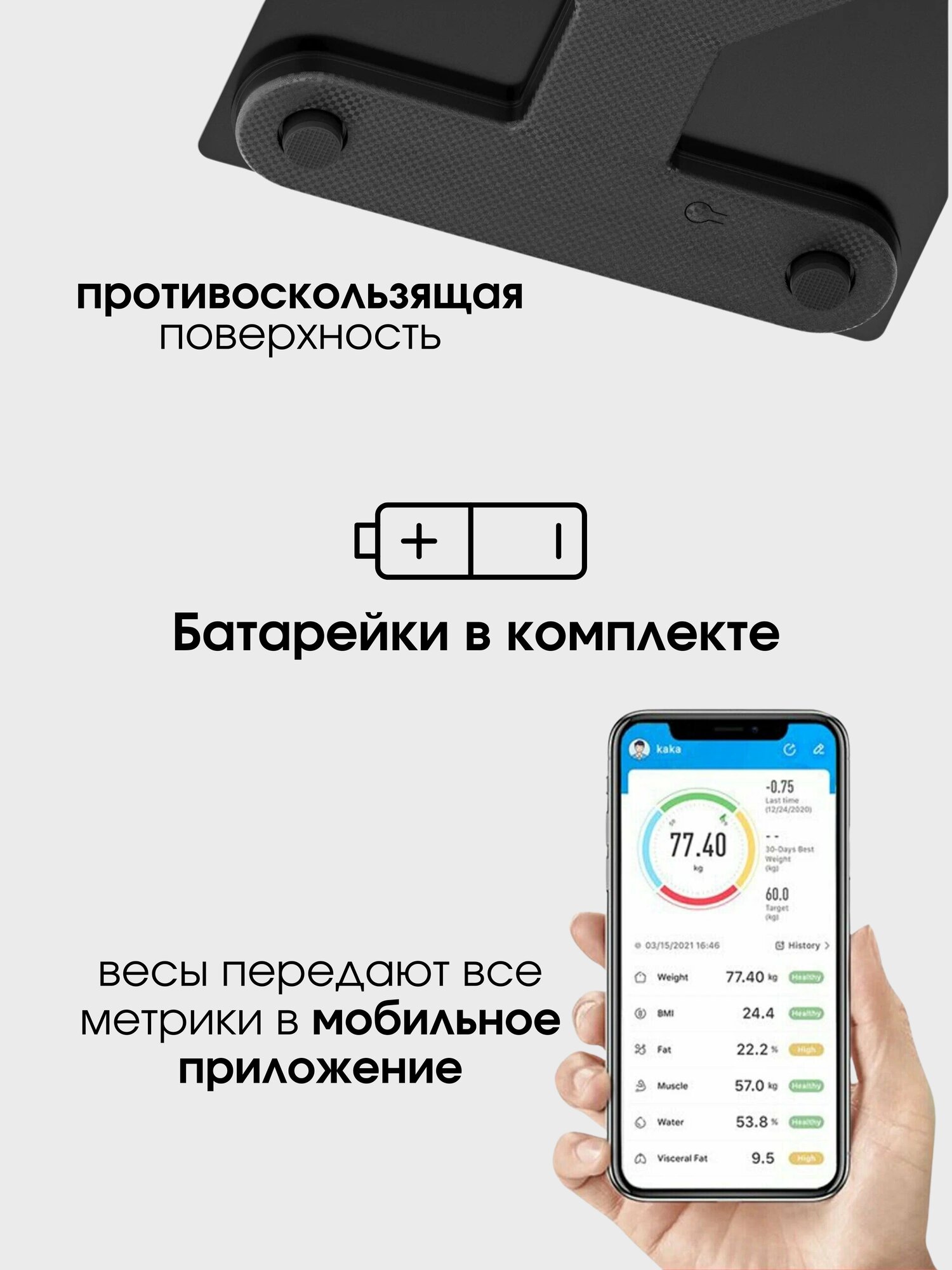 | Дополнительные функции | измерение температуры воздуха / определение доли воды / определение доли жировой ткани / определение доли костной ткани / определение доли мышечной ткани / память / постановка цели / расчет ИМТ (BMI) |