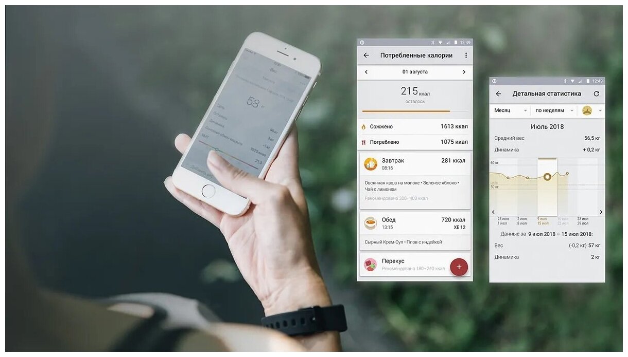 | Дополнительная информация | расчет калорий (в покое и во время тренировок); дневник питания (калорийность 16 млн блюд и продуктов); дневник тренировок; контроль потребления воды; установка целей; статистика; для Android 4.3+, iOS 9.0+, BLE 4.0; журнал давления; неограниченное количество пользователей; база с информацией о калорийности 16 миллионов продуктов и блюд; индикация заряда батареи; напряжение элементов питания: 4.5 В |