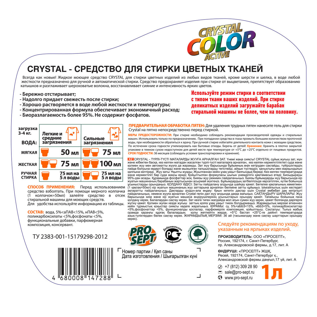 Купить Prosept Crystal Жидкое моющее средство для стирки цветных тканей,1 л